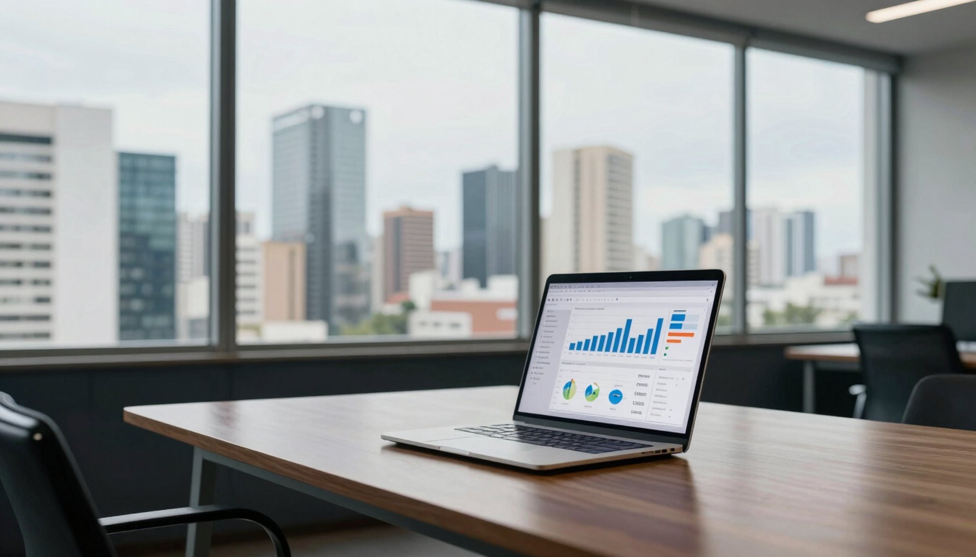 A strategic planning session with professional advisors around a table, looking at growth charts and market analysis in Mato Grosso. Lighting is sophisticated with dark navy and pale mist accents.